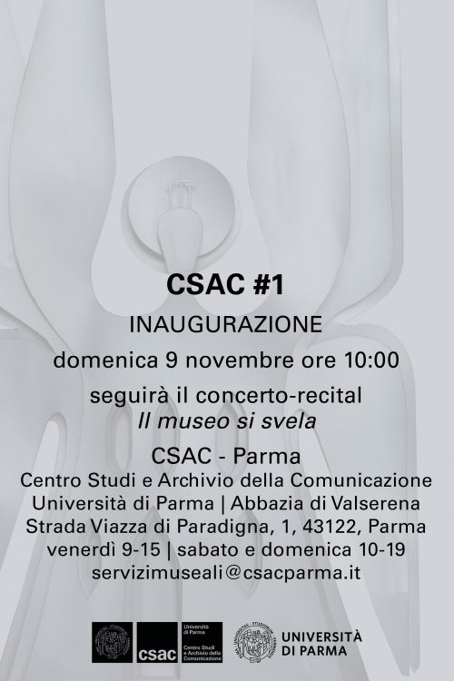 Dopo diversi mesi di chiusura, il CSAC – Centro Studi e Archivio della Comunicazione dell’Università di Parma riapre al pubblico.L’inaugurazione è fissata per domenica 9 novembre alle ore 10.00 all’Abbazia di Valserena e sarà seguita, alle ore 11.15, dal concerto-recital Il Museo si svela di Daniele Ruzza (violino solo), primo appuntamento del ciclo Oltre le Opere / Dentro alla Musica – Intorno allo CSAC, che intreccia musica, parola e arte visiva in dialogo con il…